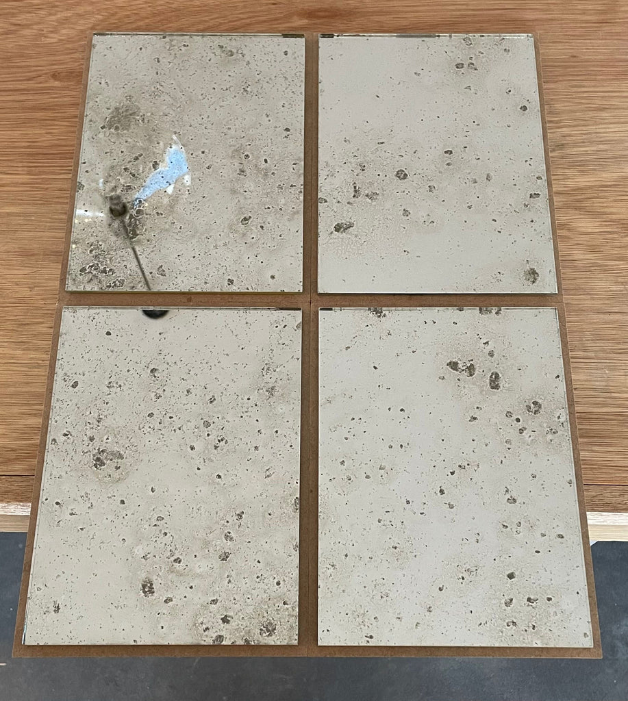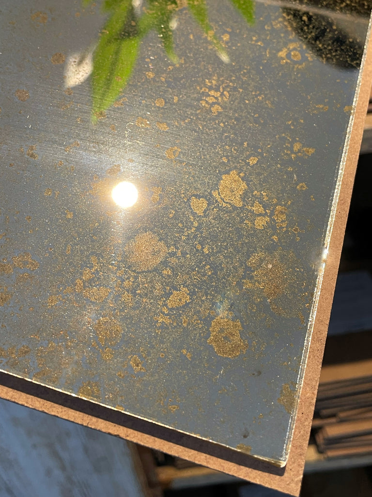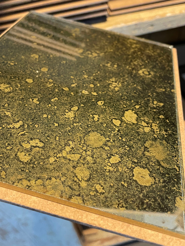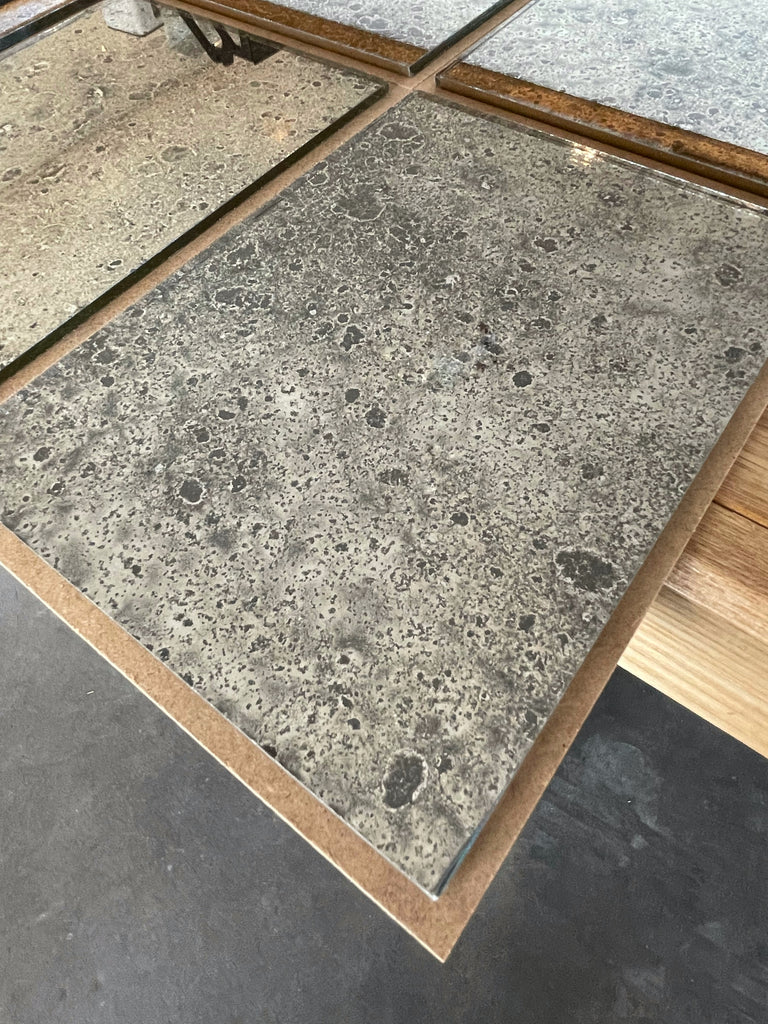 Our current complete range of mirror finishes on clear and tinted glass. We have some interesting reverse gilded, verre églomisé, glass and we are always open to your ideas and welcome commissions to develop different finishes with glass and decorative gilt surfaces too.